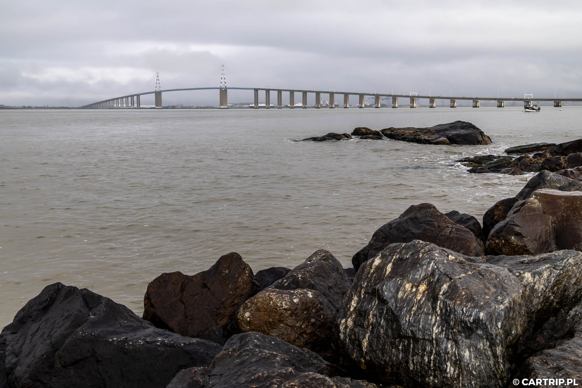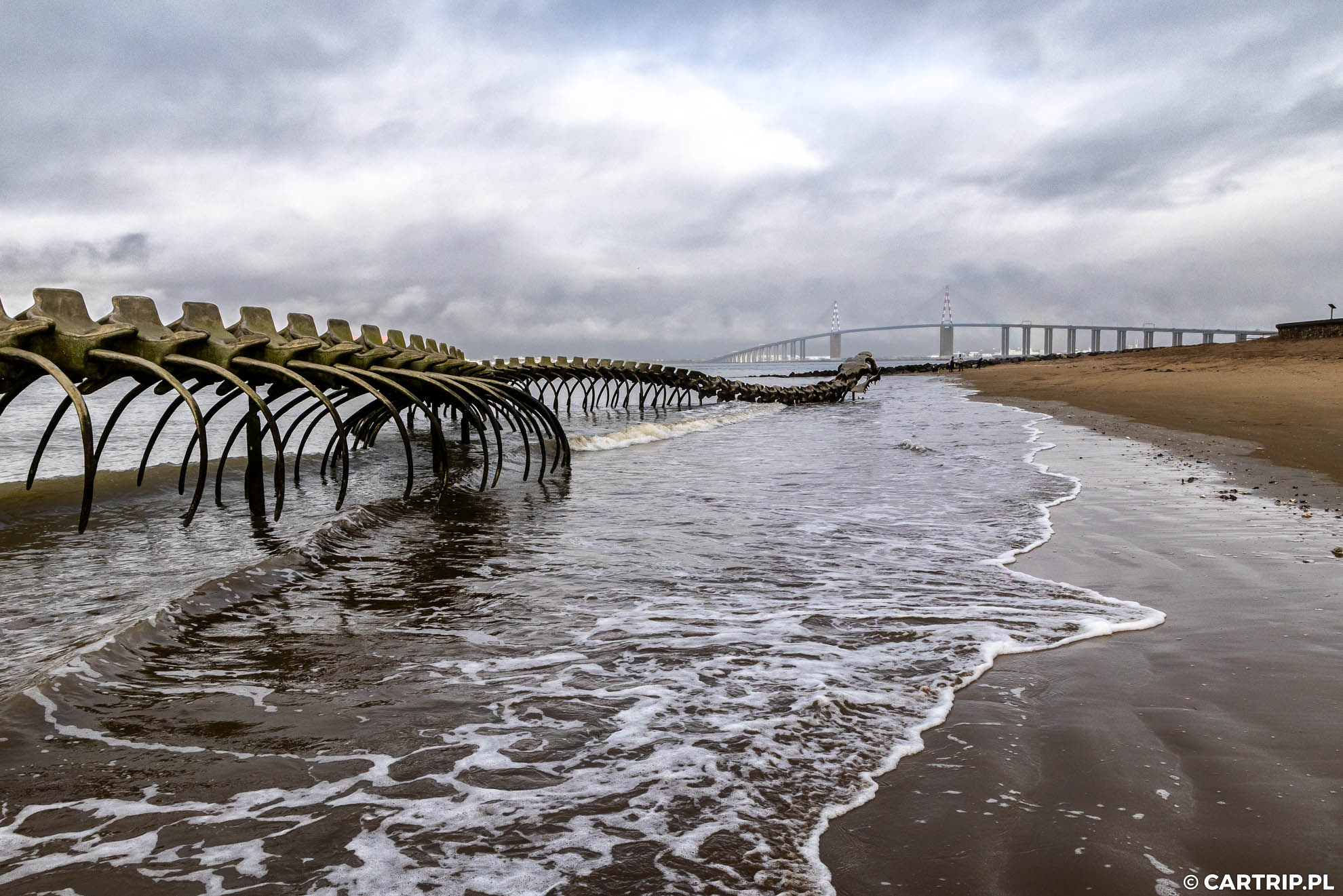 Kiedy ruszyłem dalej na południe, przede mną wyrósł monumentalny most Saint-Nazaire. Wspinając się na jego łuk, czułem, jak otwiera się widok na ogromne ujście Loary. Po zjeździe skręciłem w pierwszą plażę by zobaczyć coś, co chciałem od dawna. Instalacja czy bardziej rzeźba, „Serpent d’Océan” to stalowy szkielet wijący się po piasku plaży. Wygląda jak pozostałość po dawnej epoce ale w sumie świetnie się komponuje z miękką linią mosty w oddali.