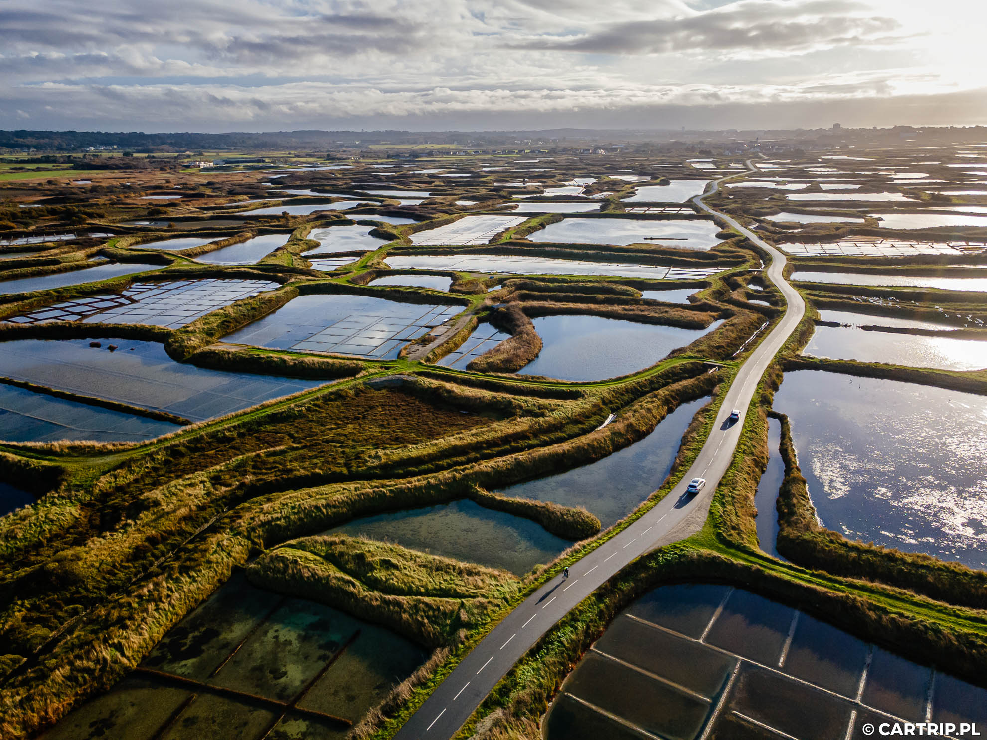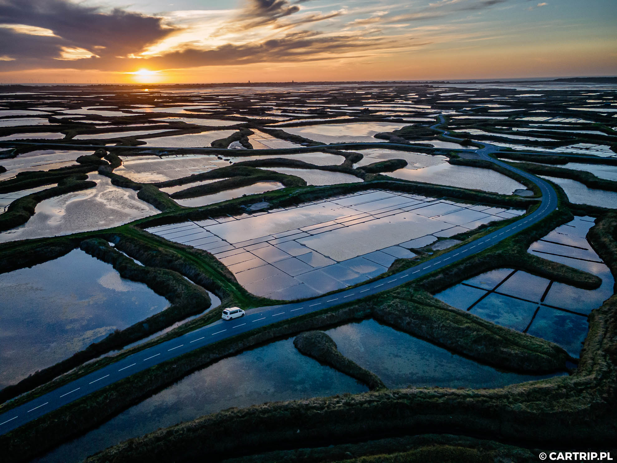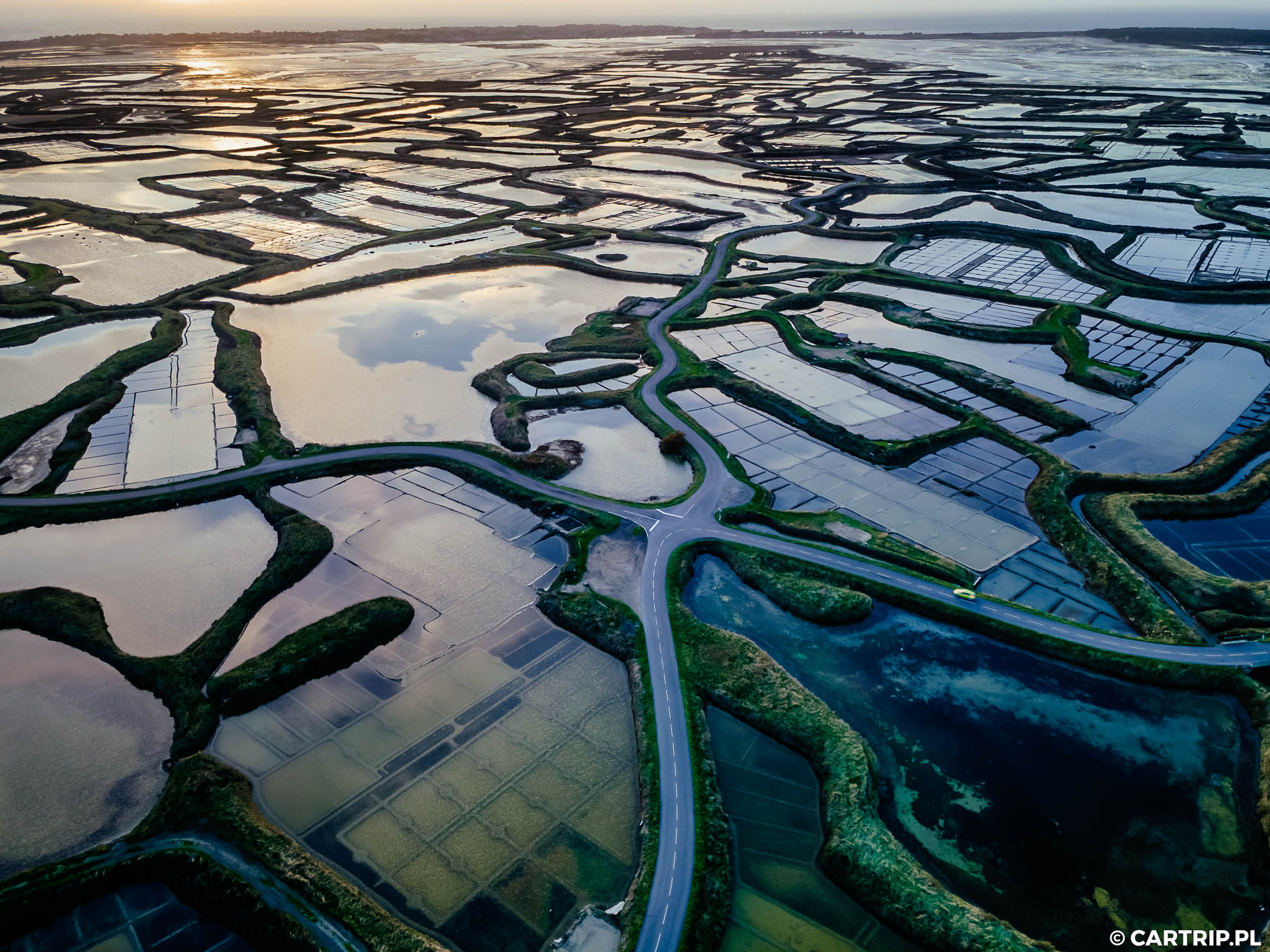 Gdy zjechałem na drogę prowadzącą do Le Croisic, miałem wrażenie, że wjechałem w inny świat. Solniska Guérande z góry wyglądają jak abstrakcyjna grafika, z poziomu drogi — jak nieskończona siatka basenów i grobli. Zatrzymałem się, wypuściłem drona i patrzyłem, jak zachodzące słońce zmienia kolory wody z minuty na minutę. Rano wróciłem tu jeszcze raz, gdy ostre światło podświetlało groble i strukturę solnisk. Dla fotografa to raj, dla kierowcy — droga poprowadzona przez obraz a nie krajobraz.